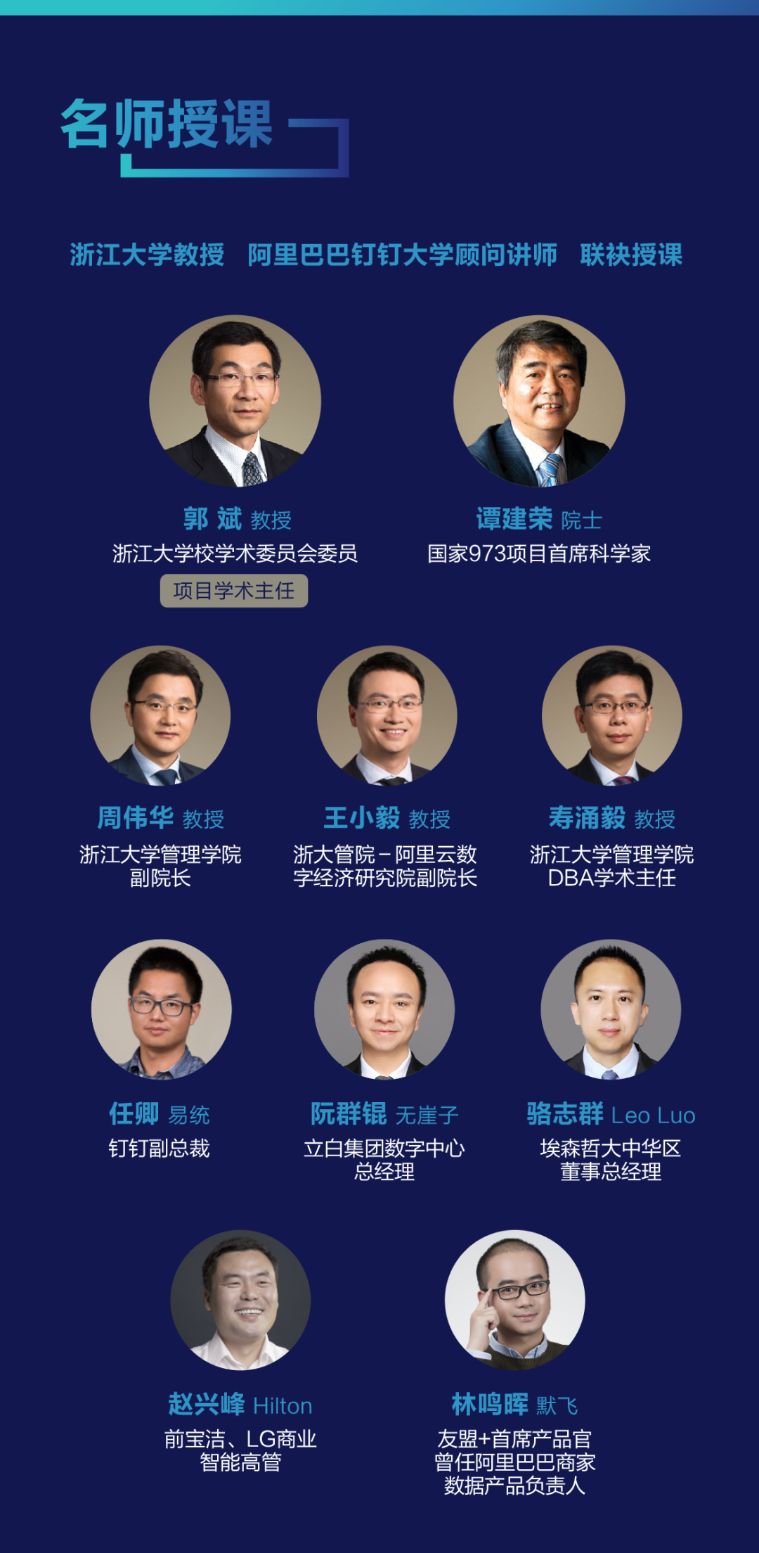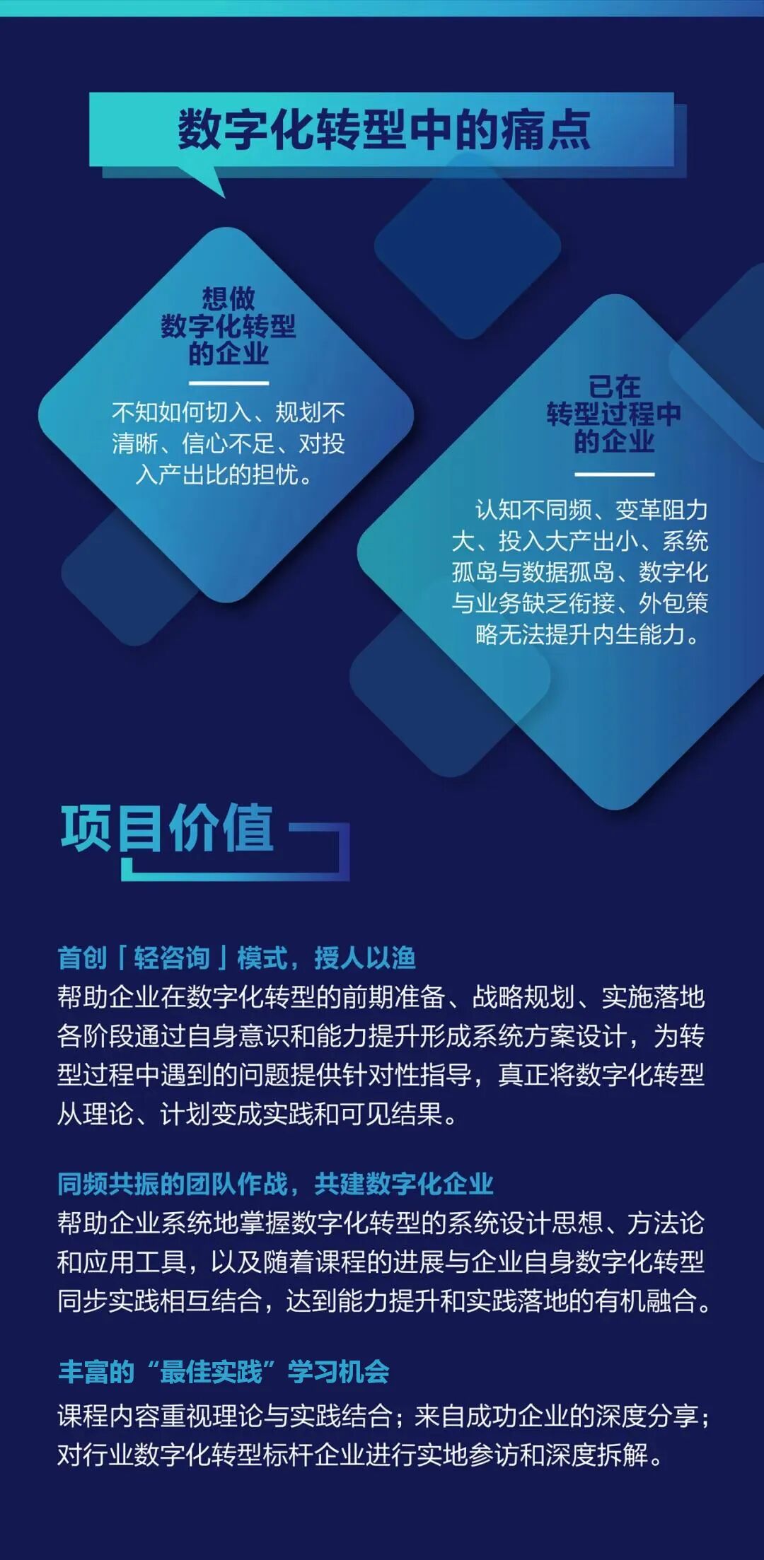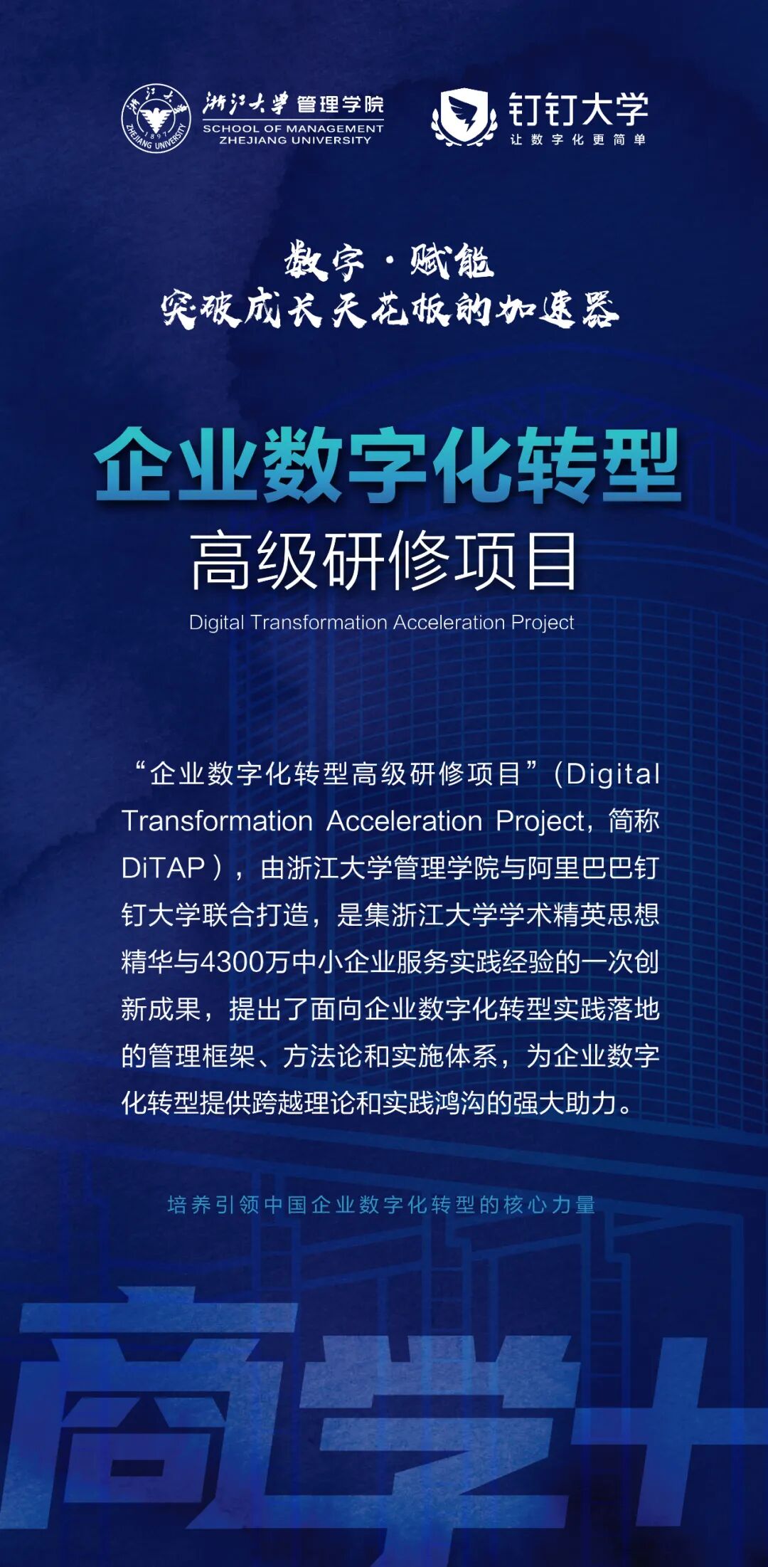 而EE项目则完全不同,它将紧紧围绕企业的痛点需求来进行深度定制与系统设计。比如EE项目的子项目之一——数字化转型高级研修项目,正是浙江大学管理学院EE项目学术主任郭斌教授团队基于前期对各类企业展开的大量调查,而后对企业的数字化转型痛点展开研究,并组织浙大相关学科的名师,联合阿里巴巴钉钉大学共同深度定制课程框架,最终打造出了一套理论与实践完美结合且成体系化的课程。